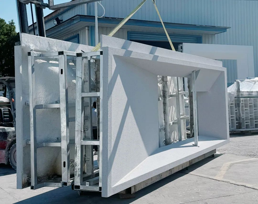 我公司深感榮幸,得以參與“一點(diǎn)”方廳水院項(xiàng)目的UHPC幕墻材料供應(yīng)工作,為長(zhǎng)三角示范區(qū)的建設(shè)貢獻(xiàn)一份力量。此次材料為表面噴砂效果的UHPC異形網(wǎng)格大窗套,最大板塊高度接近7米,生產(chǎn)時(shí)一體成型,無(wú)拼縫。UHPC的高塑性和可加工性使得窗套的設(shè)計(jì)更加靈活多樣,能夠滿足不同建筑風(fēng)格和個(gè)性化需求。通過(guò)模具成型和精細(xì)加工,可以創(chuàng)造出獨(dú)特的紋理、形狀和顏色,使窗套成為建筑外觀的點(diǎn)睛之筆。